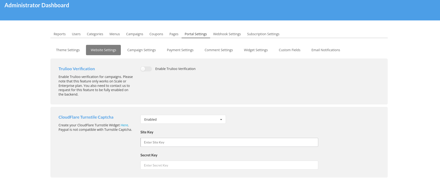Admins can now enable Turnstile from the Portal Settings → Website Settings section of the dashboard.